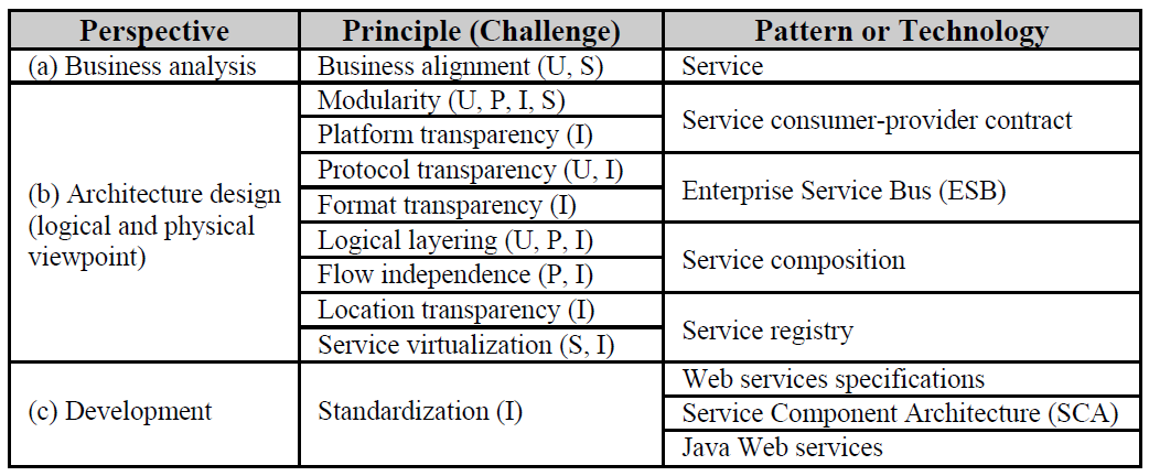 My 2009 definition of SOA by way of principles (loose coupling, first and foremost) and patterns (service contract and others) can be found in Chapter 2 of my PhD thesis. Here is an excerpt (legend: U stands for user and channel diversity, P for process and resource integrity, I for integration needs and interoperability, S for semantics of business information):
